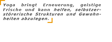 Vielen, vor allem chronisch Erkrankten, fehlt aufgrund Ihrer Beschwerden die Freude an der Bewegung. Durch langsame Körperstellungen (Asanas), leichte Atemtechniken (Pranayama) und Entspannung aus dem klassischen Hatha Yoga können Bereiche wie Beweglichkeit, Muskelstärkung, Energie und tiefes Bewusstsein gleichermaßen "genährt" werden. Durch zugelassene Atemvorgänge findet der Körper Zugang zum eigenen Kraftzentrum.
